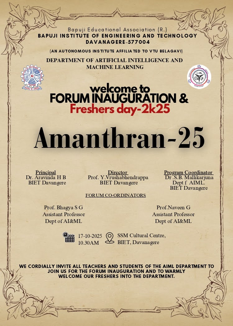 The Department of Artificial Intelligence And Machine Learning is organizing the inauguration of a forum and Fresher's Day for students joining the 2022-26 batch.