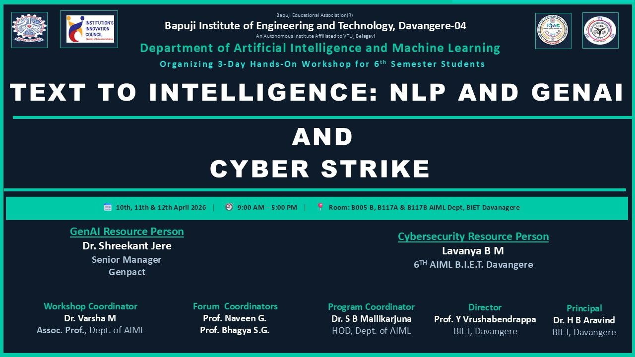 The Department of Artificial Intelligence and Machine Learning at Bapuji Institute of Engineering and Technology is organizing a 3-day hands-on workshop titled “Text to Intelligence: NLP & GenAI.” This workshop is designed for 6th semester AI & ML students and focuses on practical learning in Natural Language Processing and Generative AI.