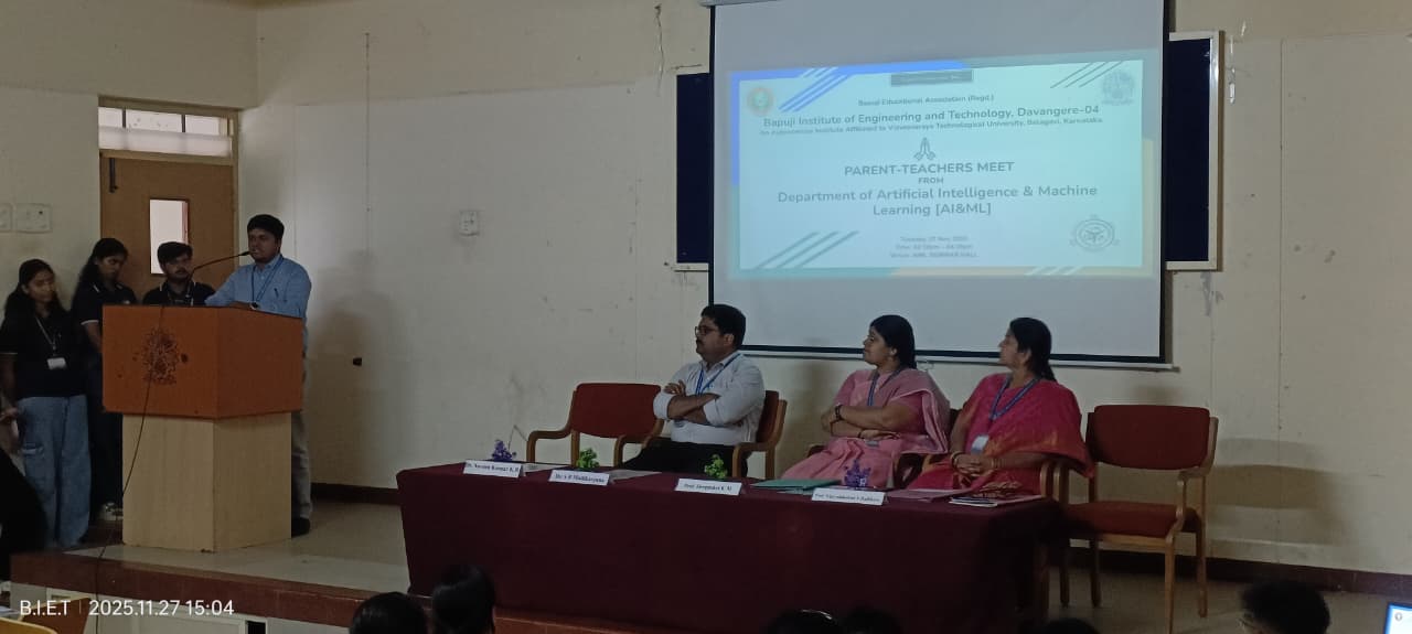 The Department of Artificial Intelligence and Machine Learning (AI&ML) at Bapuji Institute of Engineering and Technology (BIET) in Davangere, established in the year 2022 with an intake of 60 and from the academic year 2024 intake increased to 240. The department aims to become a center of excellence in AI and ML education, research, and innovation. The curriculum covers fundamental and advanced topics, including Artificial Intelligence, Machine learning algorithms, Data science, Neural networks, Natural Language Processing and Computer Vision. The curriculum is designed to foster creativity, critical thinking, and problem-solving skills, preparing students for the rapidly evolving technics in the field of AI & ML. The department boasts highly qualified faculty, state-of-the-art laboratories, and strong industry ties, ensuring students gain practical experience through internships, projects, and industry collaborations. Department also focuses on interdisciplinary research in areas like Deep learning, Robotics, and IoT, the department actively participates in national and international conferences, contributing to the broader AI and ML community. Committed to continuous learning and professional development, the department regularly hosts workshops, seminars, and guest lectures. By equipping students with the latest knowledge and skills, the Department of AI and ML at BIET is dedicated to producing skilled professionals ready to address real-world challenges and drive technological advancements globally in the field AI and ML.