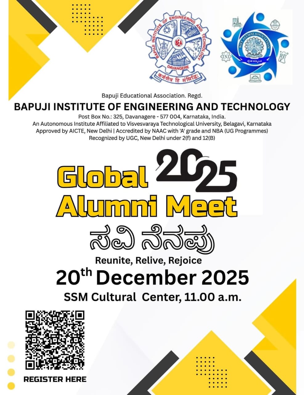 We cordially invite all of you for the inaugural function of alumni meet of our institute - Savinenapu, to be held at 11.00 AM on 20th December 2025 in SSM Cultural Centre of BIET Campus.