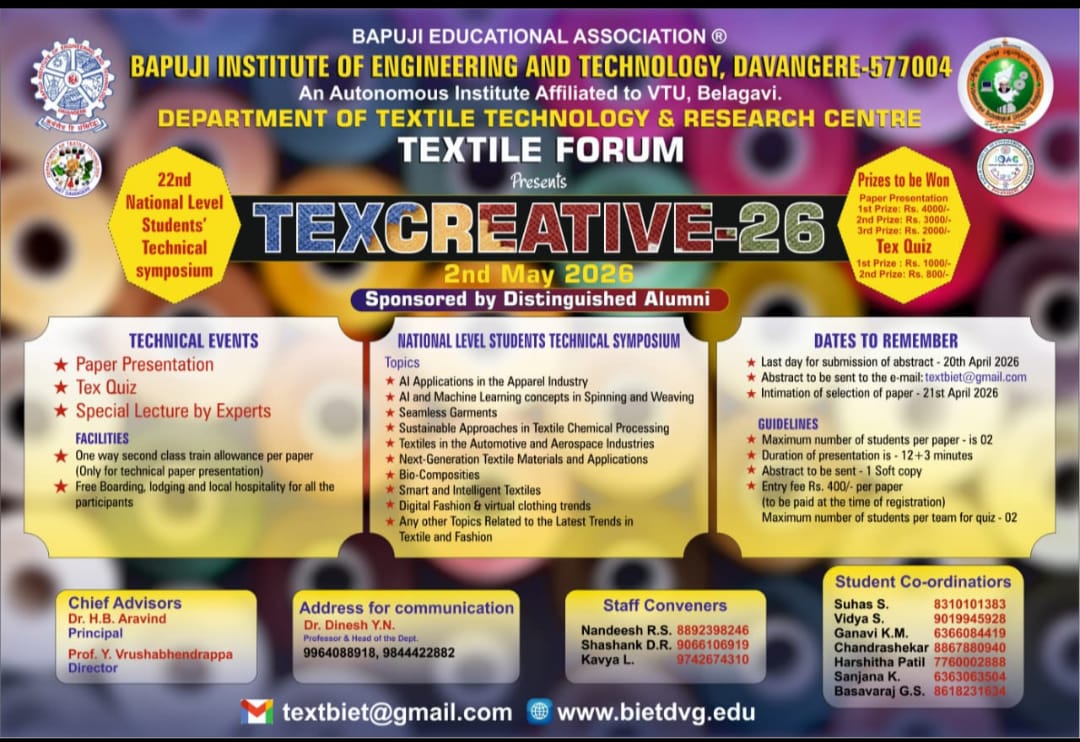 Texcreative-26, the 22nd National Level Students Technical Symposium, is organized by the Department of Textile Technology & Research Centre, BIET on 2nd May 2026.