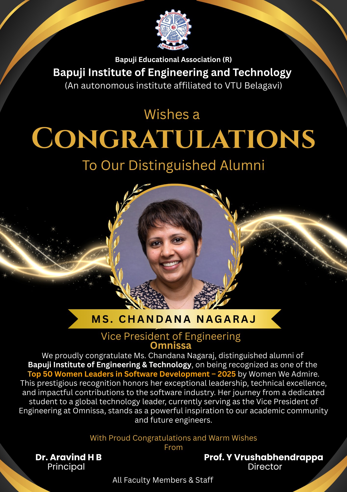 Bapuji Institute of Engineering and Technology proudly honors Ms. Chandana Nagaraj, Vice President of Engineering at Omnissa, for being named one of the Top 50 Women Leaders in Software Development – 2025 by Women We Admire. Her remarkable journey from BIET to global tech leadership inspires future engineers and reflects the institute’s legacy of nurturing talent.