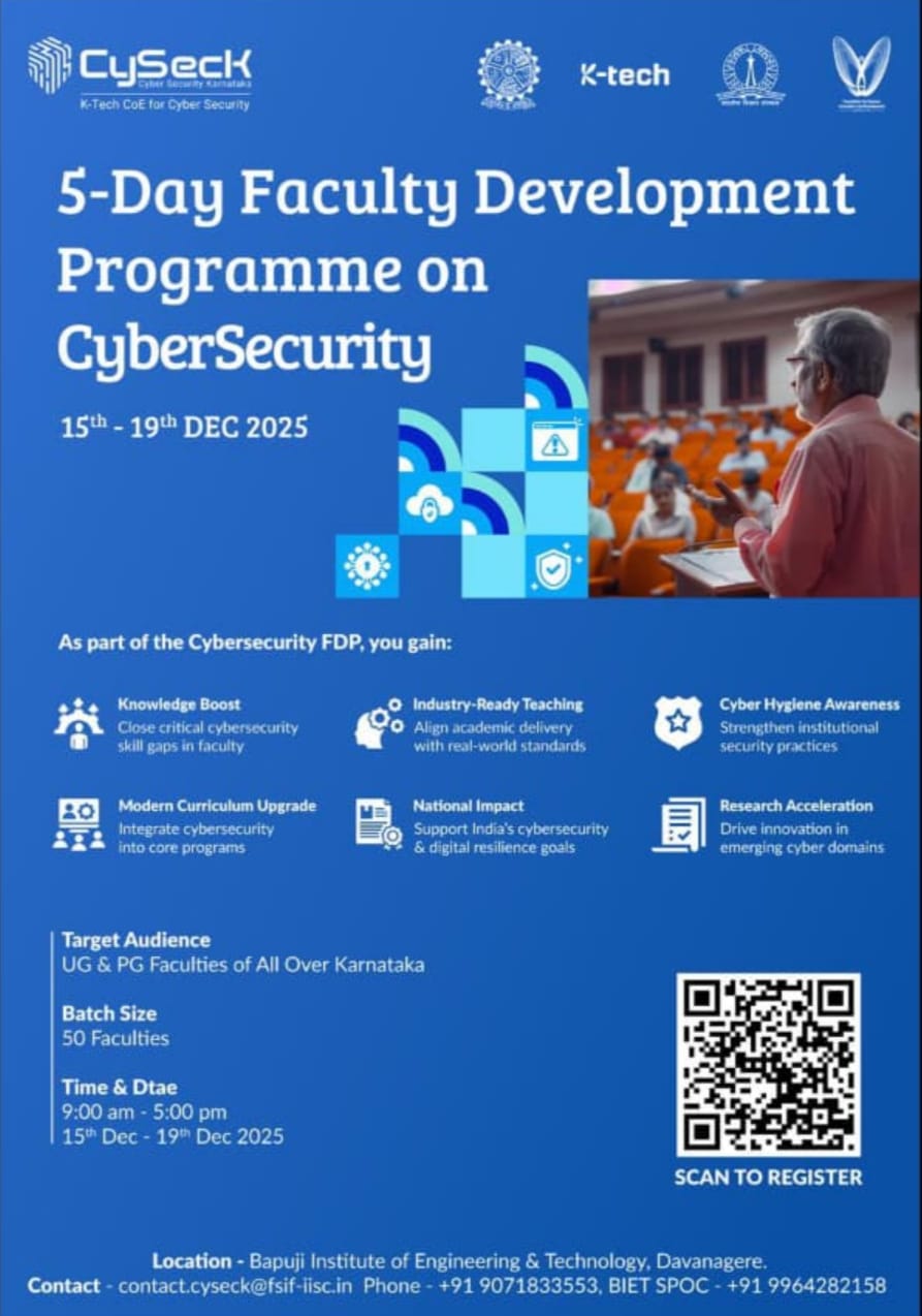 A 5-Day Faculty Development Programme on CyberSecurity will be held from 15th to 19th December 2025 at BIET Davanagere, organized by CySecK & K-Tech CoE. It focuses on bridging skill gaps, upgrading curriculum, and boosting research in emerging cyber domains.