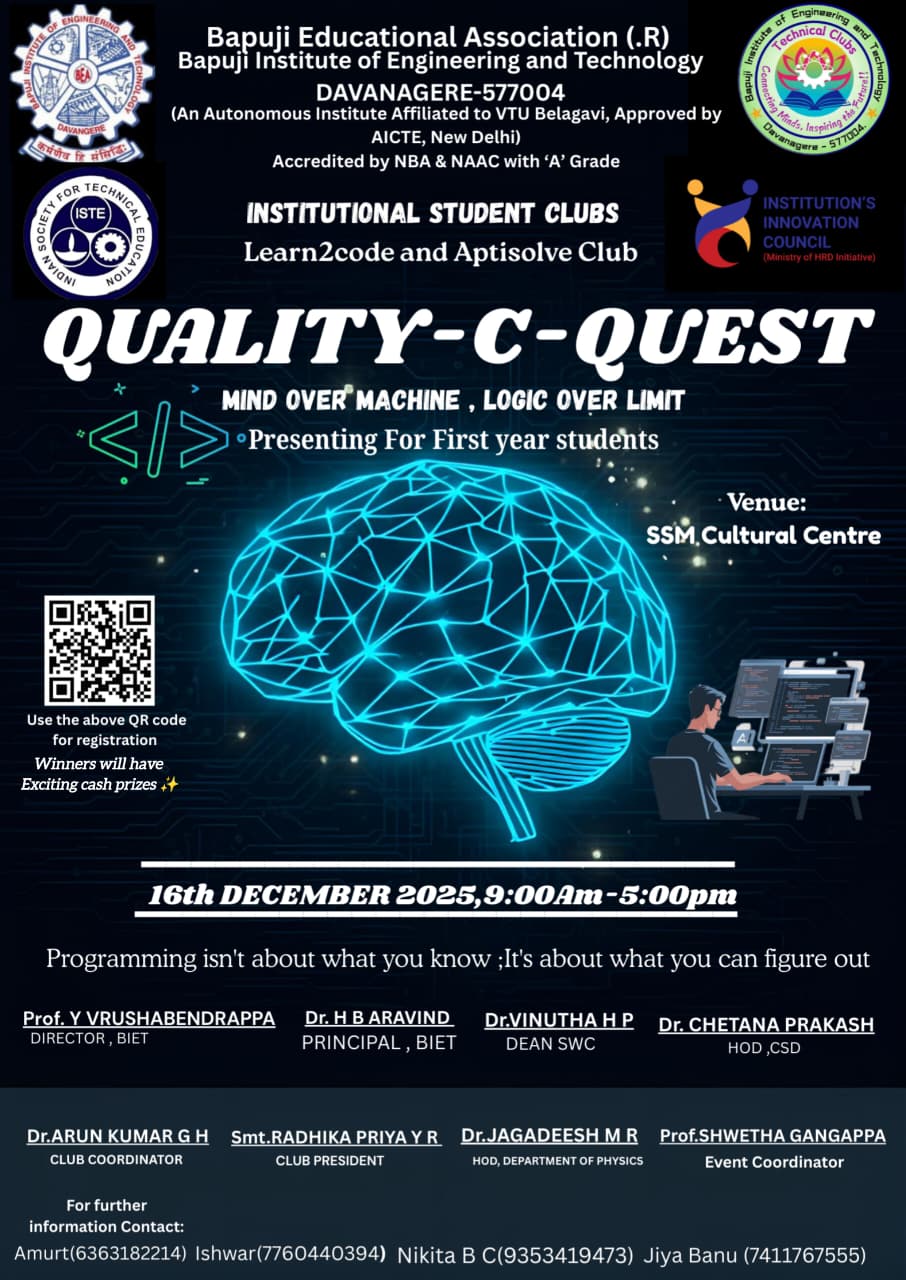 A one-day coding challenge for first-year students at BIET Davanagere, organized by Learn2code and Aptisolve Club. Held on 16th December 2025, it celebrates logic, problem-solving, and the spirit of programming with the theme “Mind Over Machine, Logic Over Limit.”