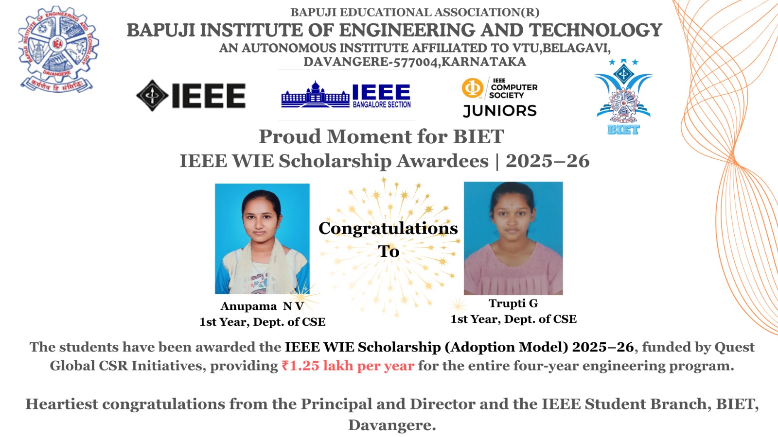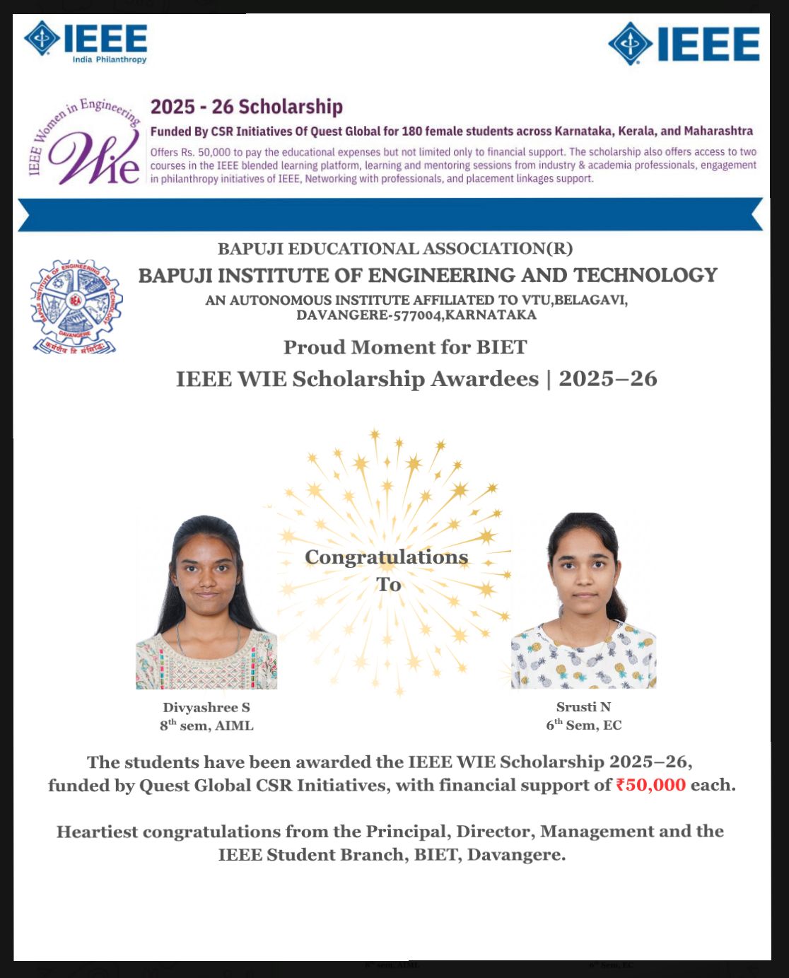 Two first-year CSE students have been awarded the IEEE WIE Scholarship (Adoption Model) 2025–26, funded by Quest Global CSR Initiatives, with ₹1.25 lakh per year support for the entire four-year engineering program.