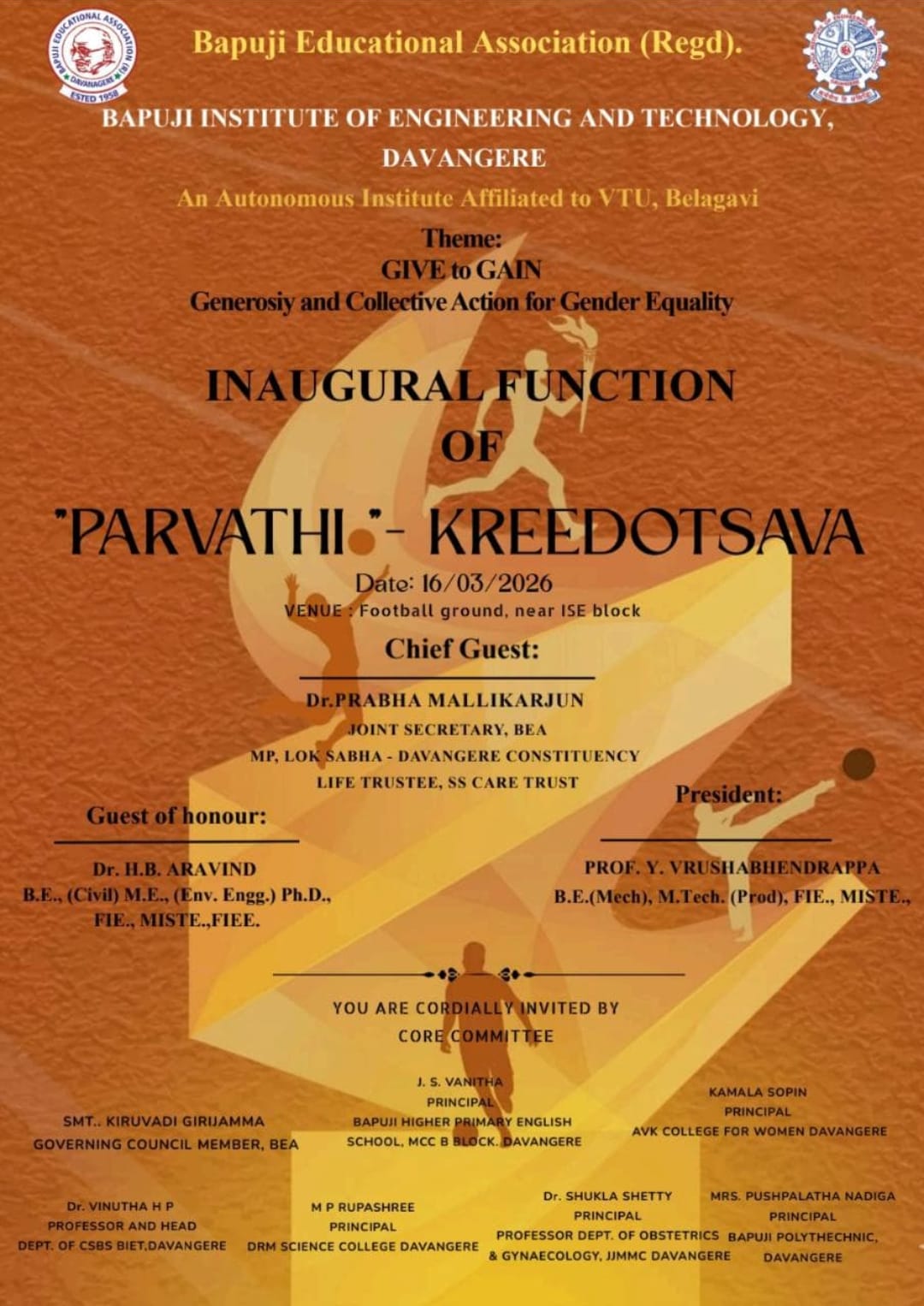 Bapuji Institute of Engineering and Technology, Davangere, proudly presents the inaugural sports festival “Parvathi - Kreedotsava” on 16th March 2026 at the BIET football ground (near ISE block).