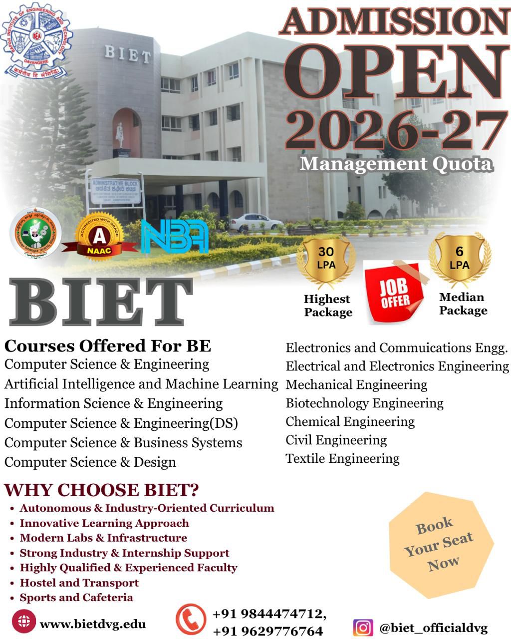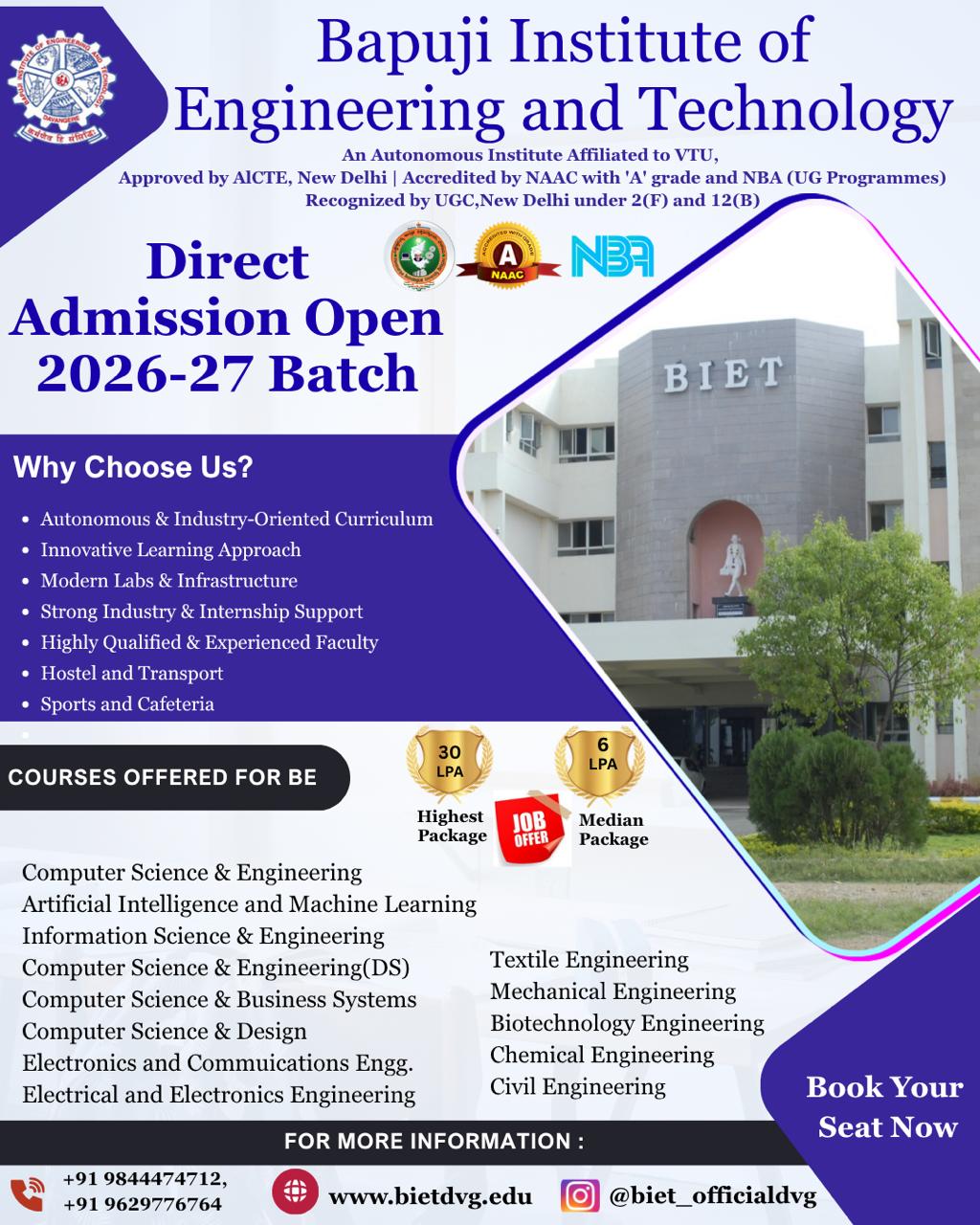 Bapuji Institute of Engineering and Technology (BIET), Davangere, invites applications for Direct Admission 2026–27 Batch. An autonomous institute affiliated to VTU and accredited with NAAC ‘A’ grade and NBA, BIET offers top engineering programs including CSE, AI & ML, ISE, ECE, Mechanical, Civil, and more.