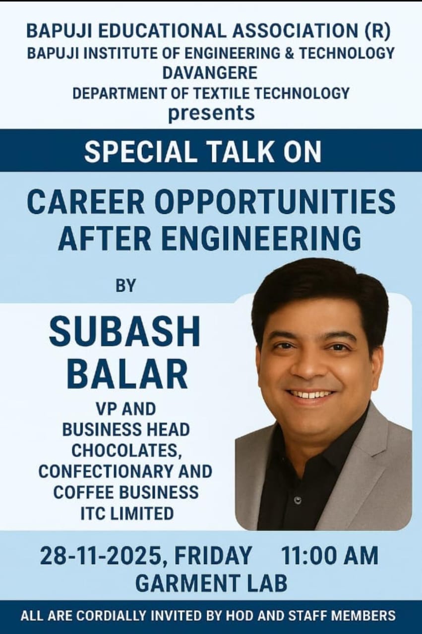 Join us for an inspiring session with Mr. Subash Balar, Vice President & Business Head – Chocolates, Confectionary & Coffee, ITC Limited, as he shares insights into navigating career paths post-engineering and unlocking opportunities in the business and technology sectors.