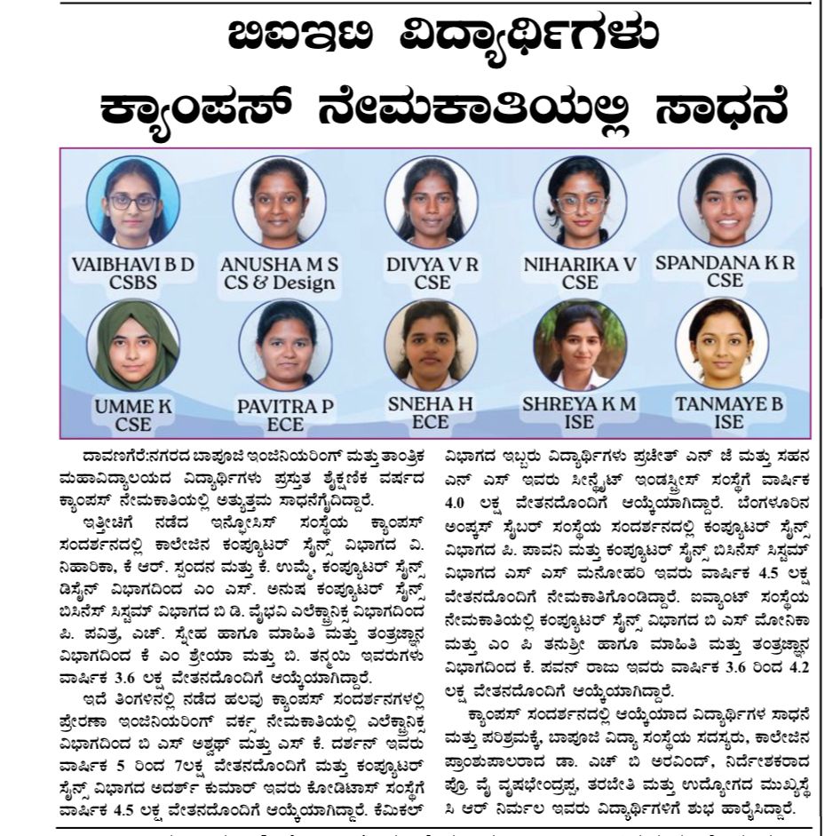 A paradigm shift in technology and innovation has made mandatory for an academic institute to foster a new generation of individuals equipped with divergent thought process, positive attitude, knowledge and technical skills to instigate new challenges for sustaining the increasing expectations of the industry. Hard work alone is no more the key to success, but individuals are expected to be consistent and work smart. Bapuji Institute of Engineering and Technology gives utmost importance in facilitating the students for felicitous placements in and off campus before their graduation. BIET strives hard to ensure that every student gets the right skill & domain knowledge. The main objective of BIET is to create knowledge and competencies/skills required by the industries with strong academic foundations. Placement cell in association with various disciplines provides a conducive environment for students. The Institute organizes activities like industry expert talk, skill development workshops, Hackathons, coding competencies that enable students to be industry ready through its ties with alumni and industry. The institute also encourages students to accomplish projects that are societal, real-time and Industry relevant during their course of study. BIET nurtures young minds to acquire the required skill sets to seize the desired career.
