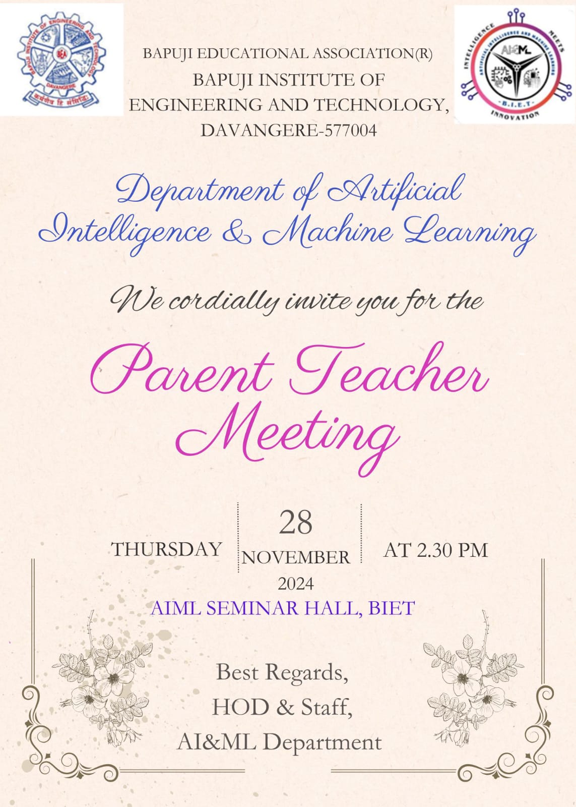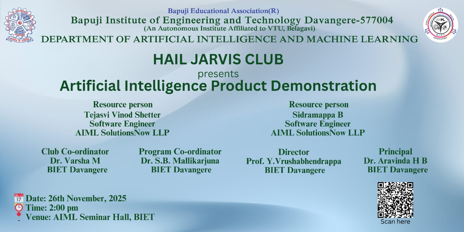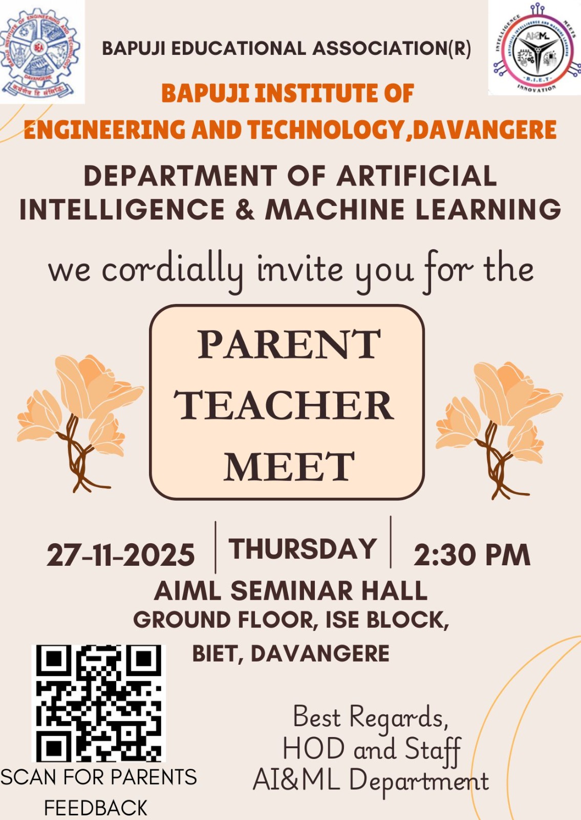 The Department of Artificial Intelligence and Machine Learning (AI&ML) at Bapuji Institute of Engineering and Technology (BIET) in Davangere, established in the year 2022 with an intake of 60 and from the academic year 2024 intake increased to 240. The department aims to become a center of excellence in AI and ML education, research, and innovation. The curriculum covers fundamental and advanced topics, including Artificial Intelligence, Machine learning algorithms, Data science, Neural networks, Natural Language Processing and Computer Vision. The curriculum is designed to foster creativity, critical thinking, and problem-solving skills, preparing students for the rapidly evolving technics in the field of AI & ML. The department boasts highly qualified faculty, state-of-the-art laboratories, and strong industry ties, ensuring students gain practical experience through internships, projects, and industry collaborations. Department also focuses on interdisciplinary research in areas like Deep learning, Robotics, and IoT, the department actively participates in national and international conferences, contributing to the broader AI and ML community. Committed to continuous learning and professional development, the department regularly hosts workshops, seminars, and guest lectures. By equipping students with the latest knowledge and skills, the Department of AI and ML at BIET is dedicated to producing skilled professionals ready to address real-world challenges and drive technological advancements globally in the field AI and ML.