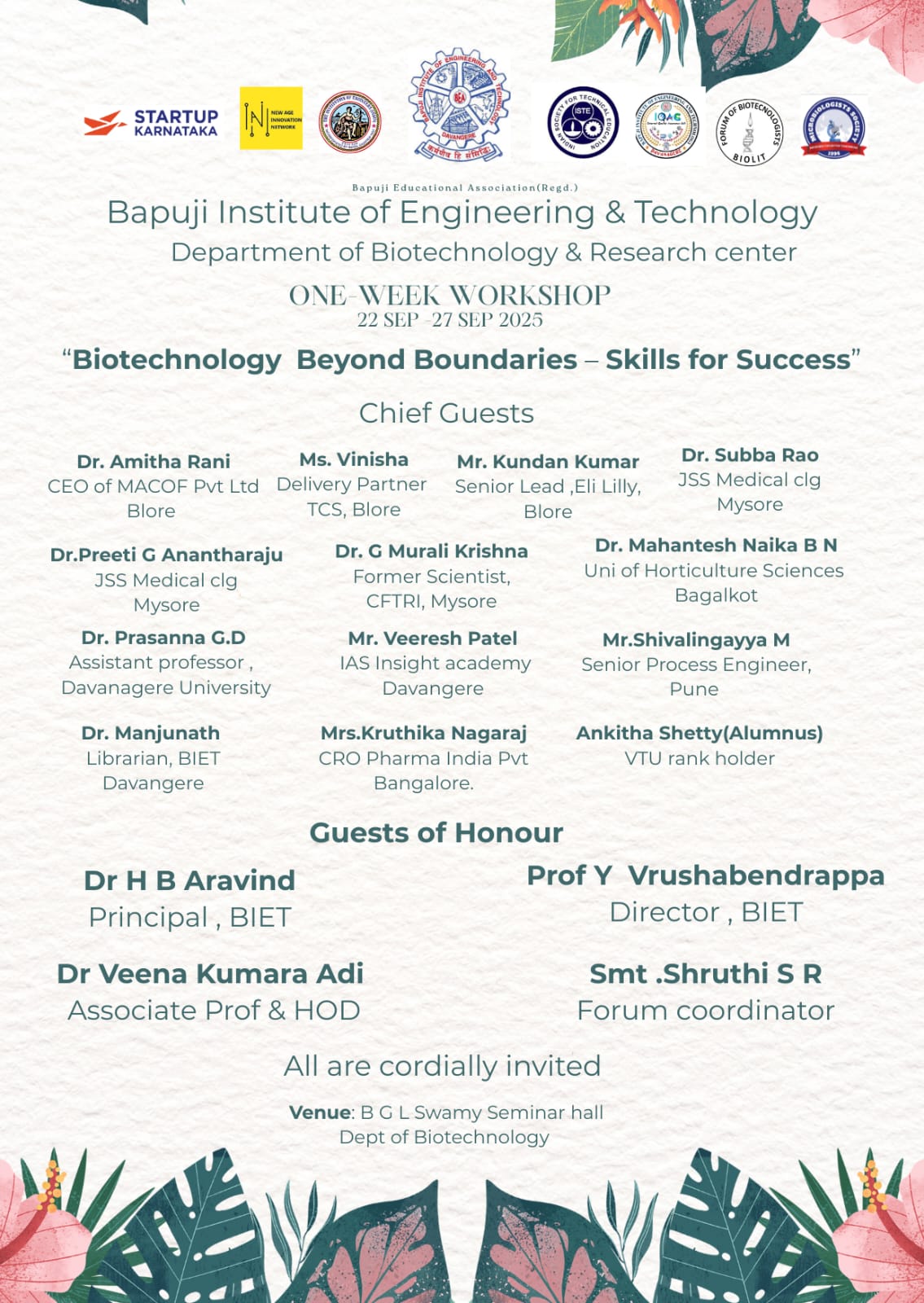 one week workshop on "Biotechnology Beyond Boundaries- Skill for Success" during 22nd sept to 27th sept 2025.