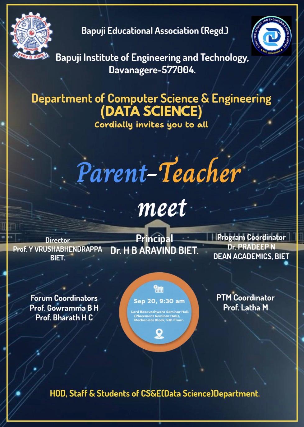 The Parents-Teacher Meeting (PTM) aims to provide a platform for parents to engage with the faculty of the Data Science Department. This event will facilitate discussions on student progress, curriculum, and departmental activities, fostering a collaborative environment for student success.