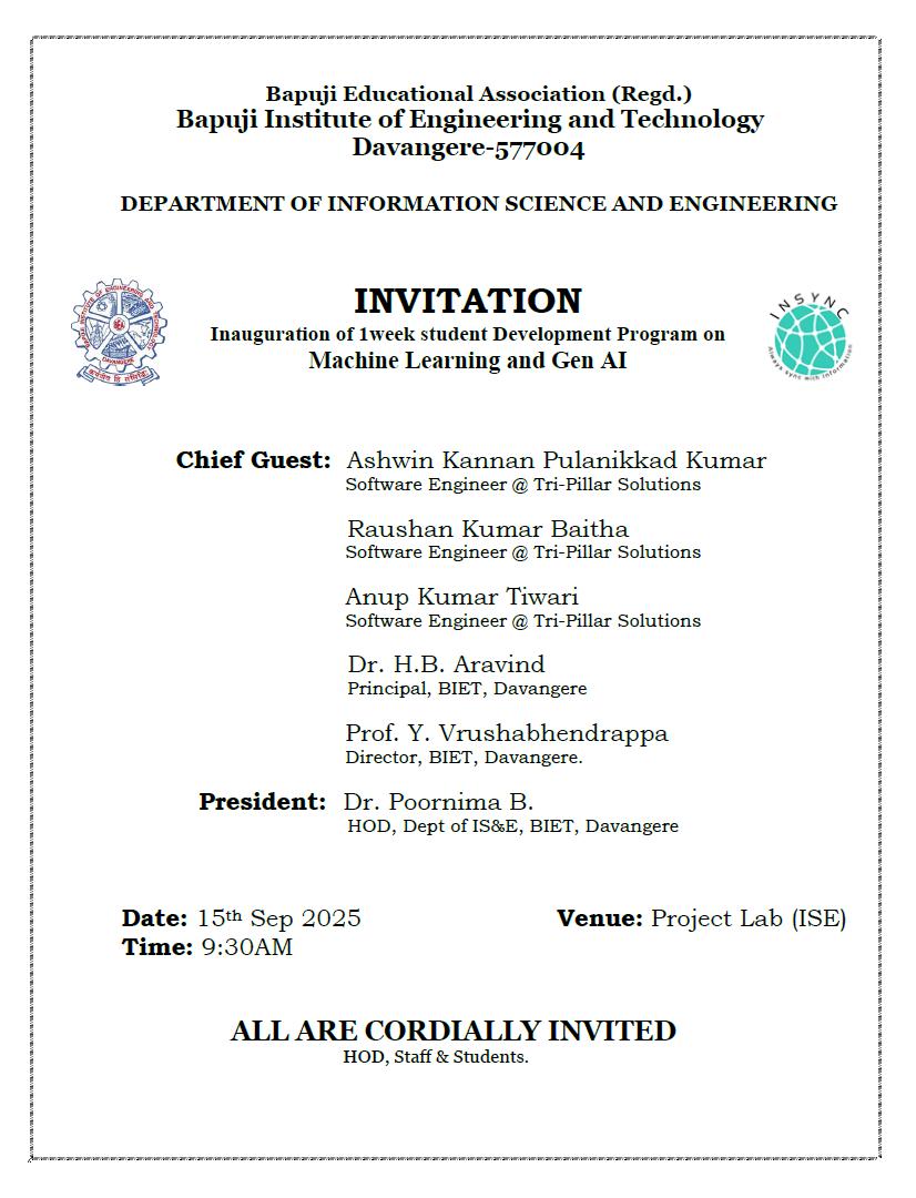 3-days Hands on Workshop on "FRONT END DEVELOPMENT" in Association with Abeyaantrix Softlab, Date: 11th to 13th of Aug 2023, Venue : Dept. of IS&E, BIET, Davangere