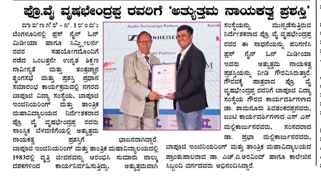 Prof. Vrushabendrappa’s award highlights his exceptional contributions to academic excellence, institutional development, and forward-thinking leadership in the field of engineering education.