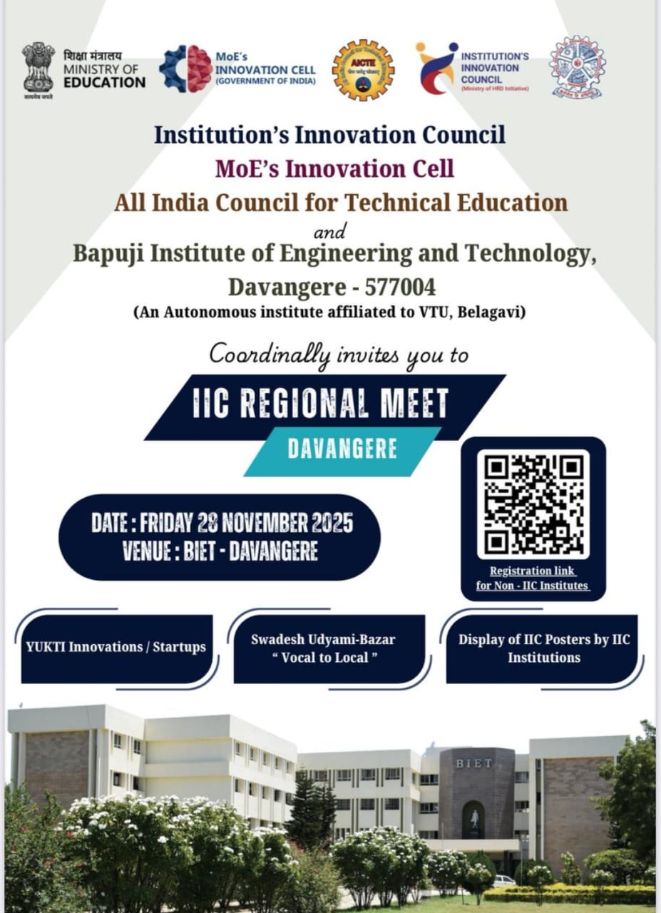 BIET, in collaboration with the Institution's Innovation Council (IIC), MoE's Innovation Cell, and AICTE, is proud to host the IIC Regional Meet – Davangere on Friday, 28 November 2025.