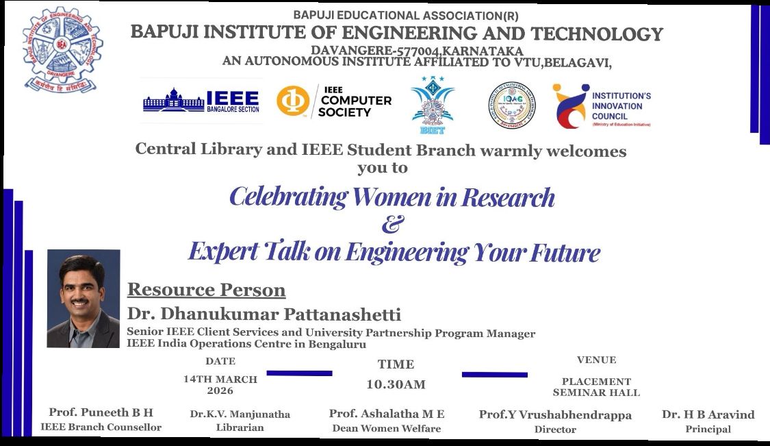 The IEEE Student Branch, BIET in collaboration with the Library Section is organizing a Felicitation Program to honor women faculty for their research publications in IEEE journals, followed by an *Expert Talk by Mr. Dhanukumar Pattanashetti* on “Engineering Your Future: Why Professional Societies Are the Launchpad to Career Success.”