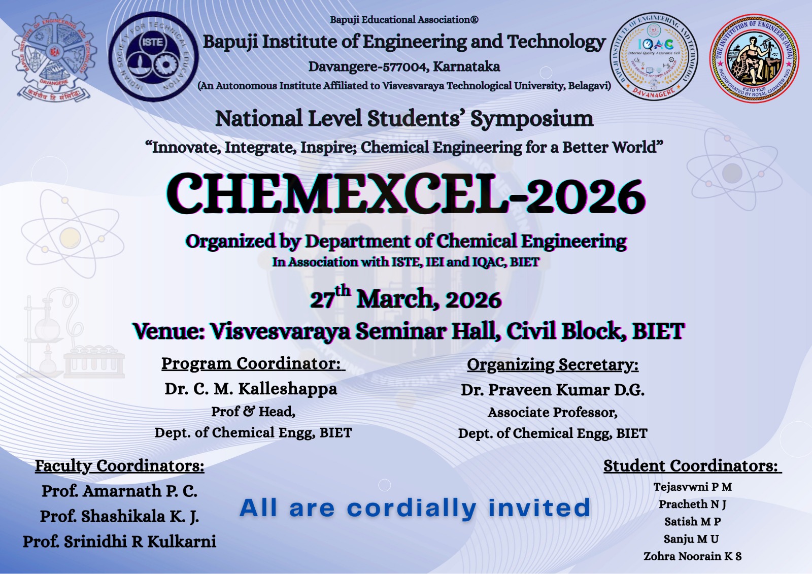 National Level Students’ Symposium organized by the Department of Chemical Engineering, BIET Davangere, on 27th March 2026. The event, held in association with ISTE, IEI, and IQAC, aims to “Innovate, Integrate, Inspire – Chemical Engineering for a Better World.”
