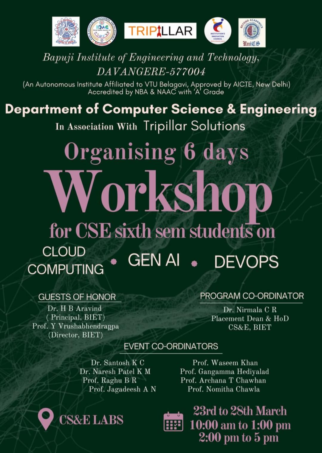 Organizing a 6-day workshop for CSE sixth semester students on Cloud Computing, Generative AI, and DevOps in association with Tripillar Solutions.